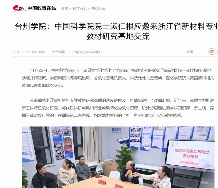 台州学院:中国科学院院士熊仁根应邀来浙江省新材料专业教材研究基地交流