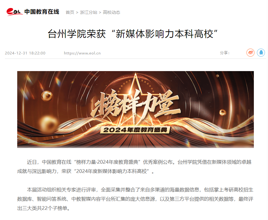 近日,中国教育在线“榜样力量·2024年度教育盛典”优秀案例公布。台州学院凭借在新媒体领域的卓越成就与深远影响力,荣获“2024年度新媒体影响力本科高校”。