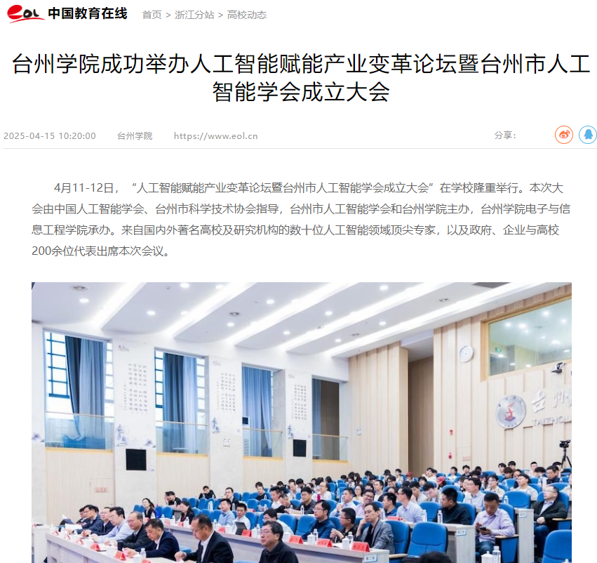 4月11日下午,台州市人工智能学会成立大会在学校国际会议厅顺利召开。台州市民政局李小兵处长在会上宣读了学会的《准予成立社会团体决定书》。台州市科学技术协会党组成员、副主席喻鸿彪出席大会并致辞。他指出,台州市人工智能学会的成立是推进创新台州建设、抢抓新质生产力发展机遇的关键一步,希望学会充分发挥“智囊团”“加速器”和“立交桥”作用,为台州数字经济发展和产业转型升级提供科技支撑。