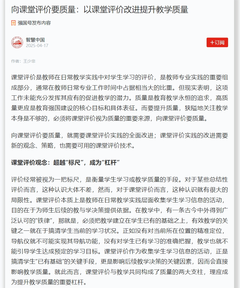 课堂评价是教师在日常教学实践中对学生学习的评价,是教师专业实践的重要组成部分,通常在教师日常专业工作时间中占据相当大的比重。但现实表明,这项工作未能充分发挥其应有的促进教学的潜力。质量是教育教学永恒的追求,高质量更应是教育强国建设的核心目标和具体表征。而要提升质量,狭隘地关注教学本身是不够的,必须将课堂评价视为质量的重要来源,向课堂评价要质量。