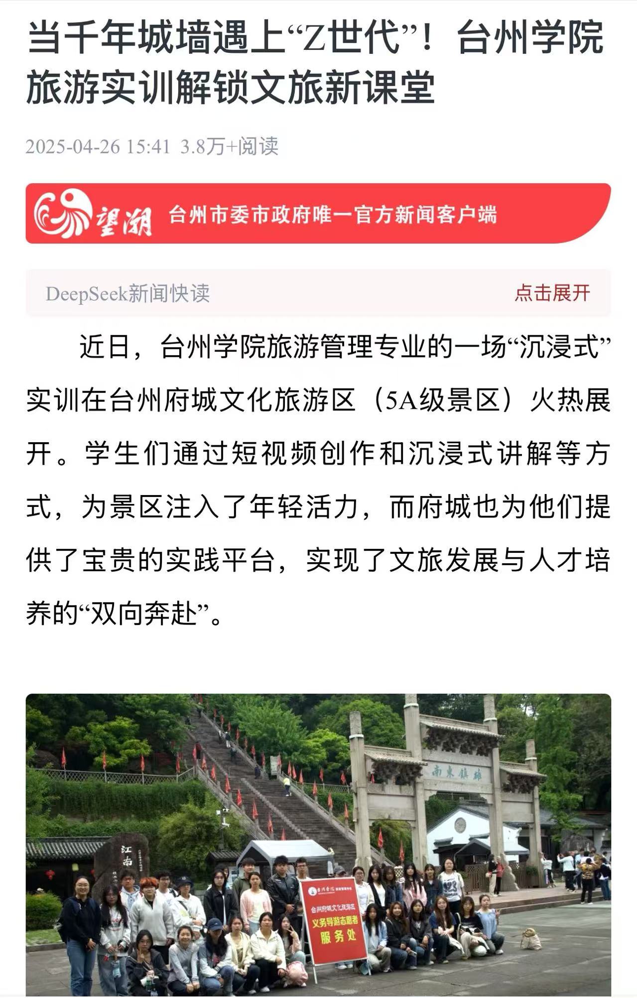 近日,台州学院旅游管理专业的一场“沉浸式”实训在台州府城文化旅游区(5A级景区)火热展开。学生们通过短视频创作和沉浸式讲解等方式,为景区注入了年轻活力,而府城也为他们提供了宝贵的实践平台,实现了文旅发展与人才培养的“双向奔赴”。