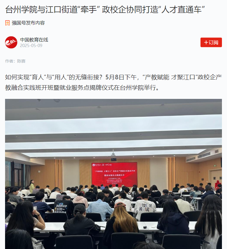 如何实现“育人”与“用人”的无缝衔接?5月8日下午,“产教赋能 才聚江口”政校企产教融合实践班开班暨就业服务点揭牌仪式在台州学院举行。
