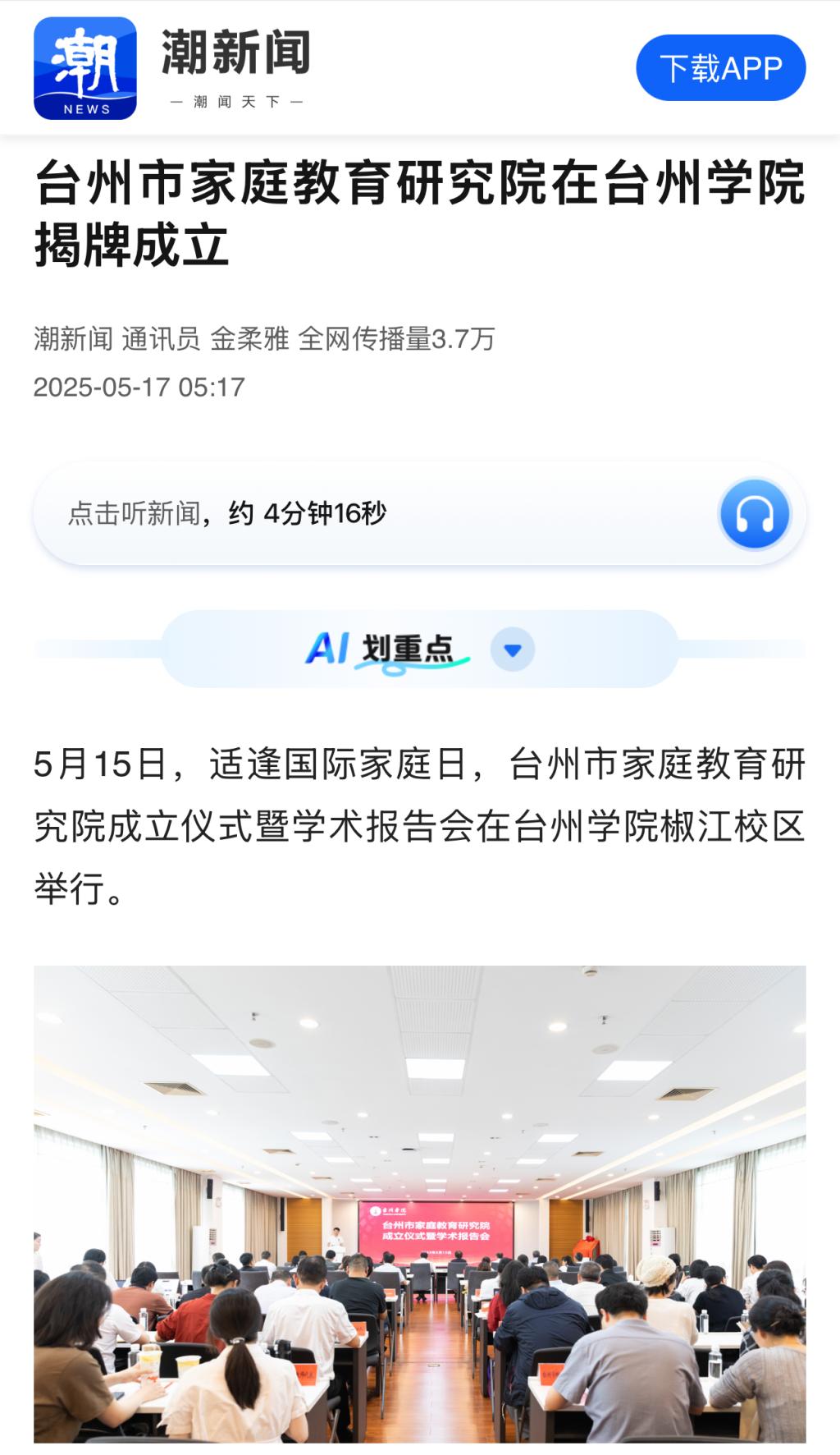 5月15日,适逢国际家庭日,台州市家庭教育研究院成立仪式暨学术报告会在台州学院椒江校区举行。