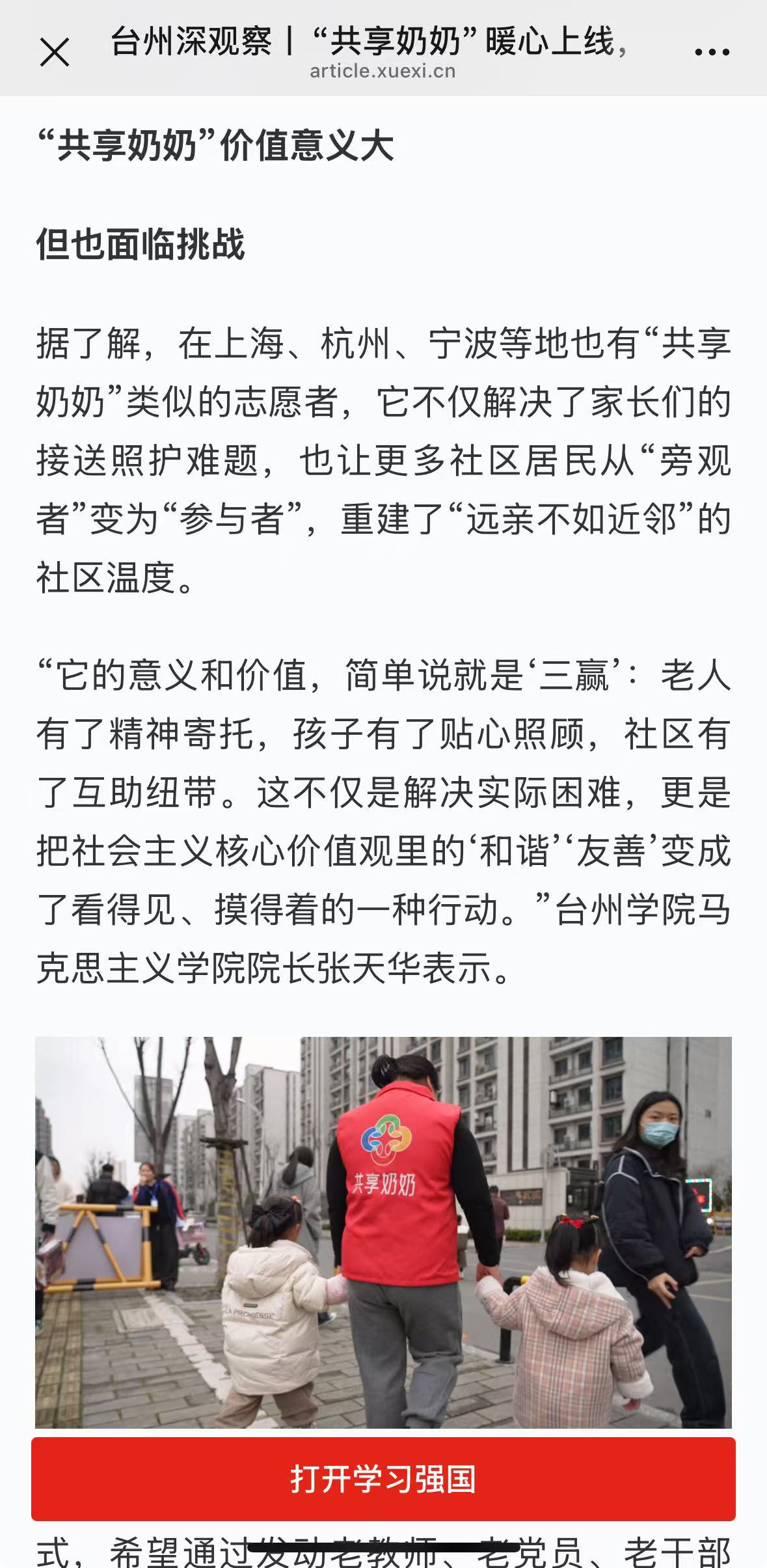 “它的意义和价值,简单说就是‘三赢’:老人有了精神寄托,孩子有了贴心照顾,社区有了互助纽带。这不仅是解决实际困难,更是把社会主义核心价值观里的‘和谐’‘友善’变成了看得见、摸得着的一种行动。”台州学院马克思主义学院院长张天华表示。