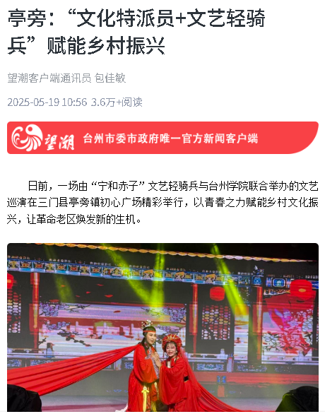 日前,一场由“宁和赤子”文艺轻骑兵与台州学院联合举办的文艺巡演在三门县亭旁镇初心广场精彩举行,以青春之力赋能乡村文化振兴,让革命老区焕发新的生机。