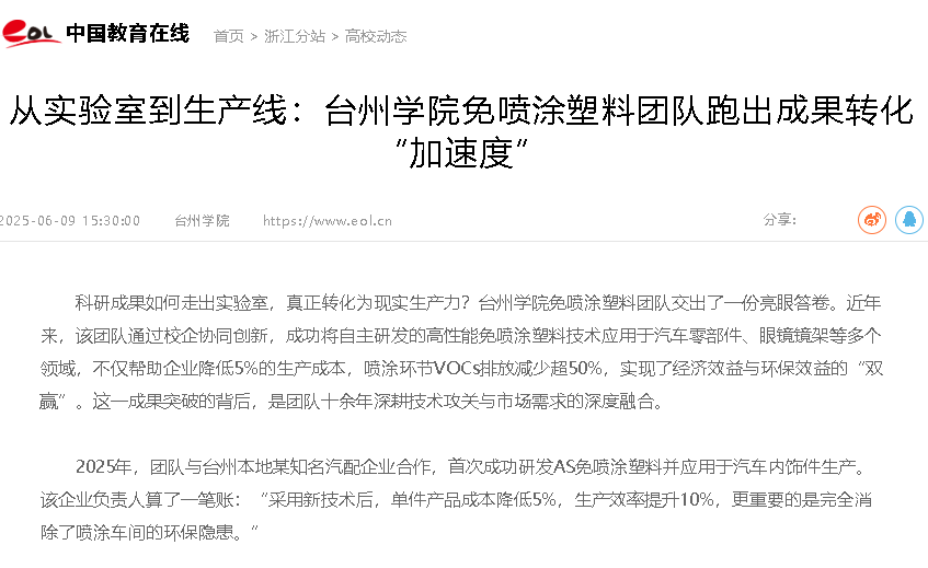 科研成果如何走出实验室,真正转化为现实生产力?台州学院免喷涂塑料团队交出了一份亮眼答卷。近年来,该团队通过校企协同创新,成功将自主研发的高性能免喷涂塑料技术应用于汽车零部件、眼镜镜架等多个领域,不仅帮助企业降低5%的生产成本,喷涂环节VOCs排放减少超50%,实现了经济效益与环保效益的“双赢”。这一成果突破的背后,是团队十余年深耕技术攻关与市场需求的深度融合。