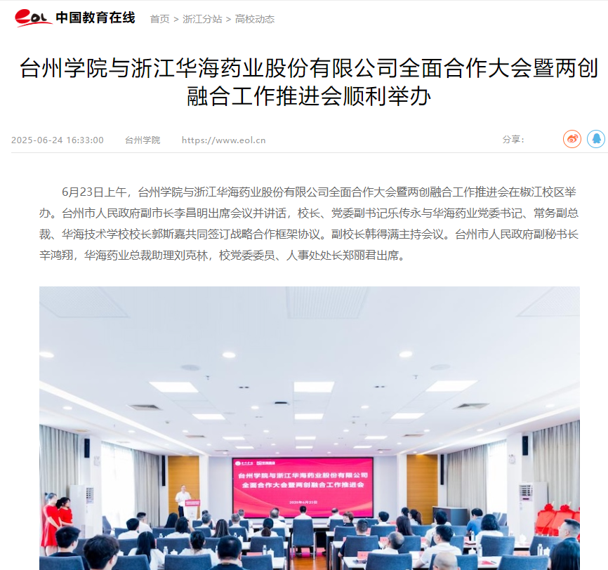 6月23日上午,台州学院与浙江华海药业股份有限公司全面合作大会暨两创融合工作推进会在椒江校区举办。台州市人民政府副市长李昌明出席会议并讲话,校长、党委副书记乐传永与华海药业党委书记、常务副总裁、华海技术学校校长郭斯嘉共同签订战略合作框架协议。副校长韩得满主持会议。台州市人民政府副秘书长辛鸿翔,华海药业总裁助理刘克林,校党委委员、人事处处长郑丽君出席。