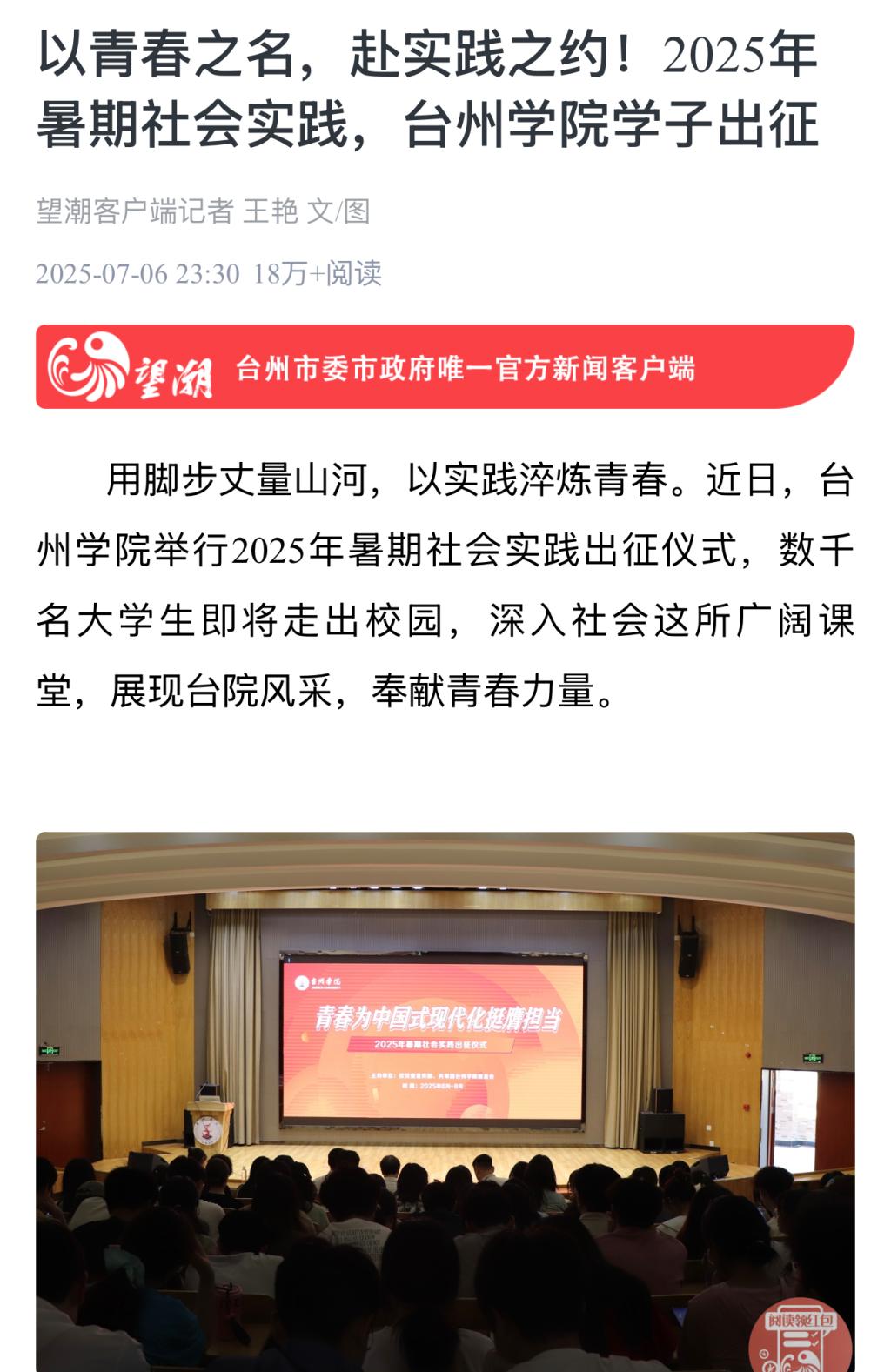 用脚步丈量山河,以实践淬炼青春。近日,台州学院举行2025年暑期社会实践出征仪式,数千名大学生即将走出校园,深入社会这所广阔课堂,展现台院风采,奉献青春力量。