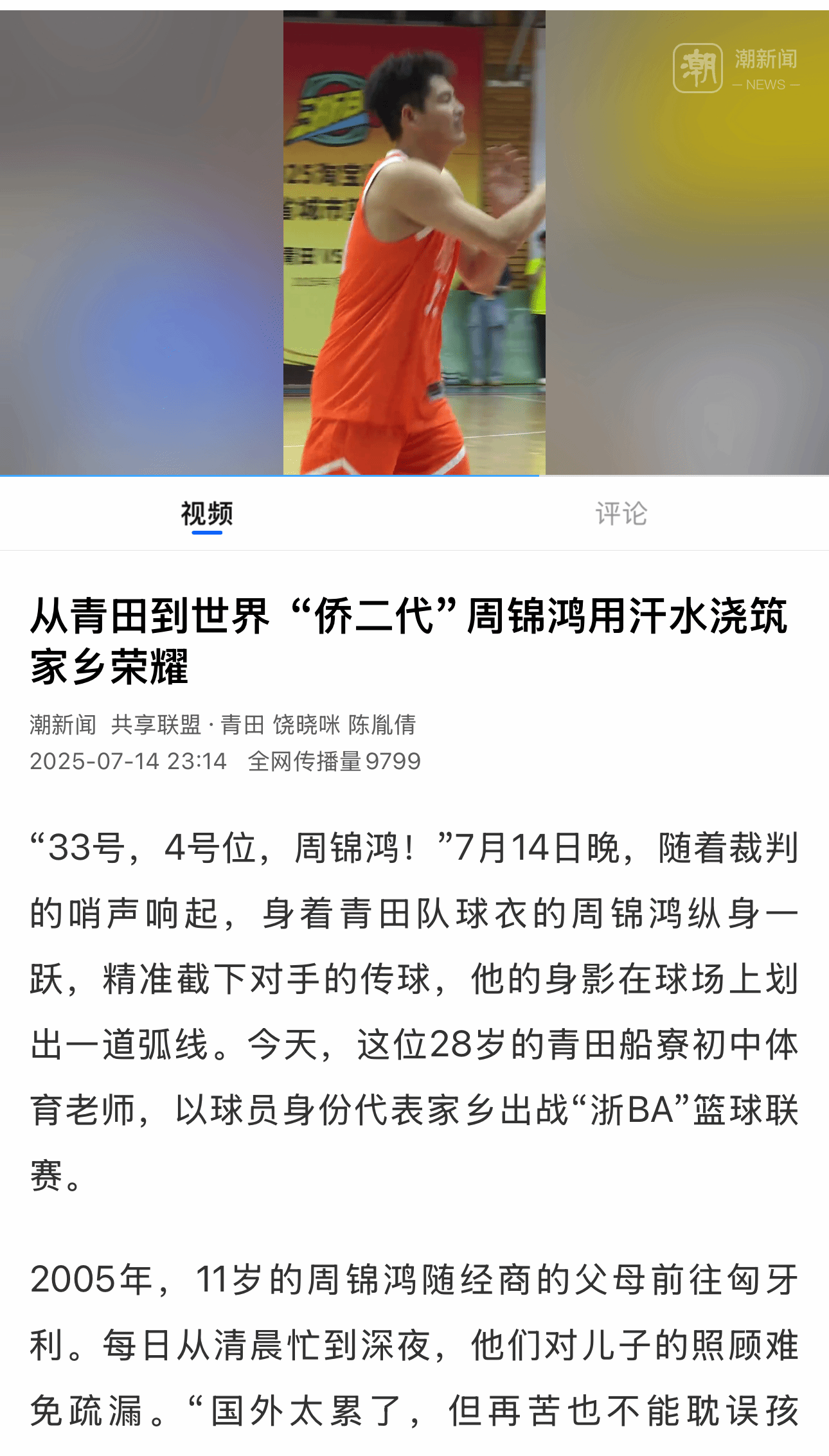 今天的“浙BA”赛场上,周锦鸿一次次突破、防守、助攻,看台上的青田球迷为他激情欢呼。而此刻,远在匈牙利的家人们也守在屏幕前,目光一刻都不敢离开比赛画面。“好球!好样的!”当看到周锦鸿在球场上一次次精彩的表现时,他父亲的脸上洋溢着自豪的笑容。“孩子回国打球、教书,这才是真正的‘落叶归根’啊。他能在自己熟悉的地方,做自己喜欢的事情,还能代表家乡比赛,我们心里比中彩票还高兴。”周锦鸿的父亲说道。