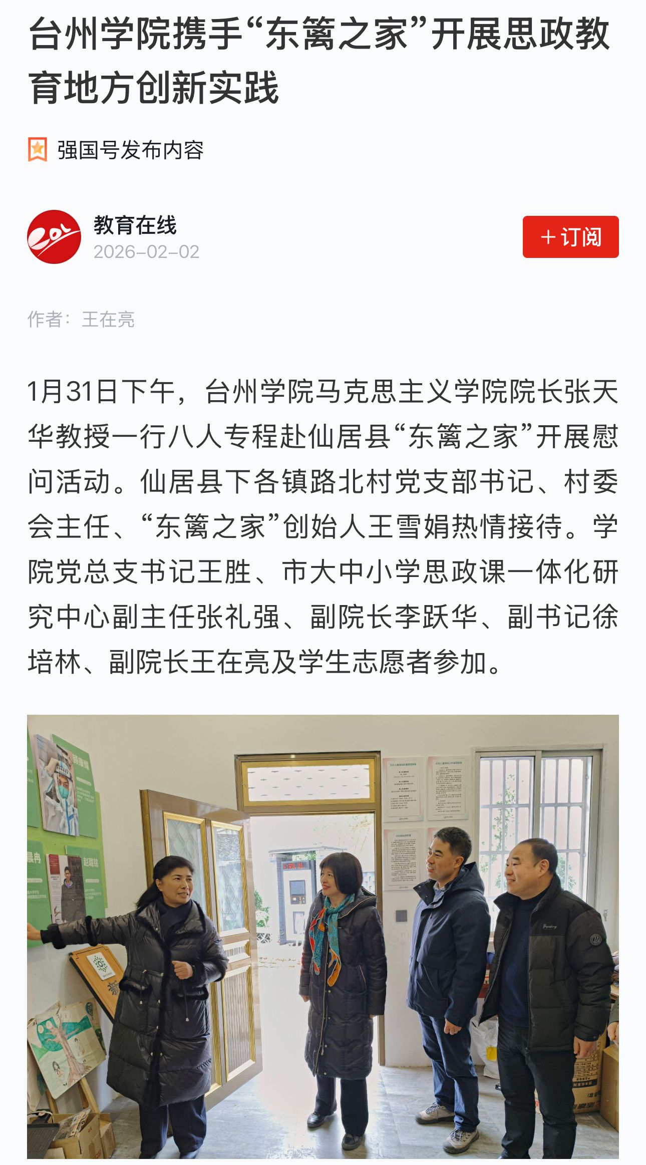 1月31日下午,台州学院马克思主义学院院长张天华教授一行八人专程赴仙居县“东篱之家”开展慰问活动。仙居县下各镇路北村党支部书记、村委会主任、“东篱之家”创始人王雪娟热情接待。学院党总支书记王胜、市大中小学思政课一体化研究中心副主任张礼强、副院长李跃华、副书记徐培林、副院长王在亮及学生志愿者参加。