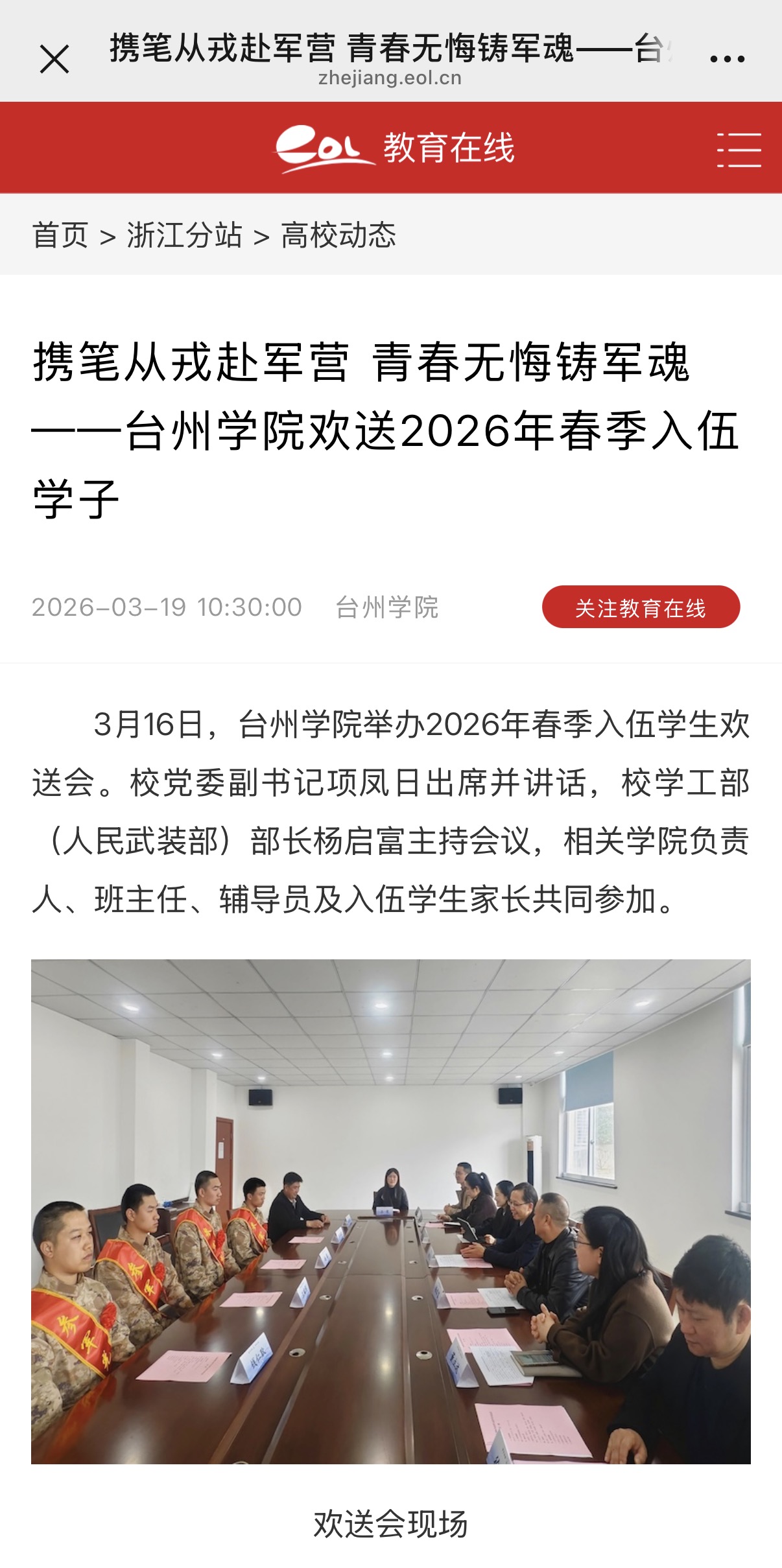 3月16日,台州学院举办2026年春季入伍学生欢送会。校党委副书记项凤日出席并讲话,校学工部(人民武装部)部长杨启富主持会议,相关学院负责人、班主任、辅导员及入伍学生家长共同参加。