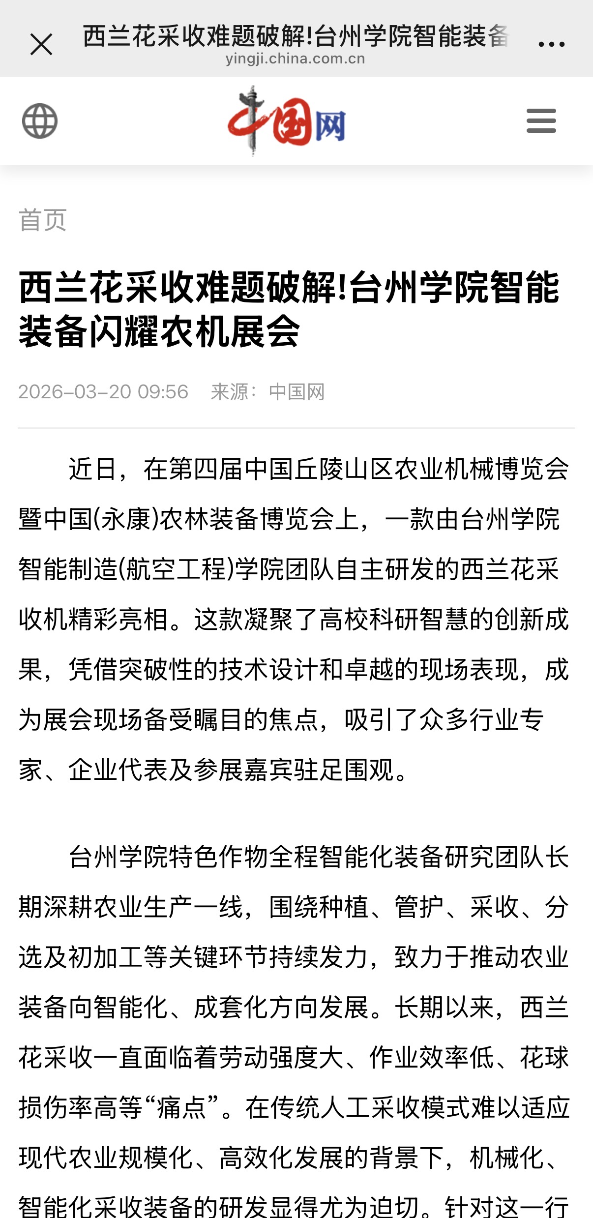 近日,在第四届中国丘陵山区农业机械博览会暨中国(永康)农林装备博览会上,一款由台州学院智能制造(航空工程)学院团队自主研发的西兰花采收机精彩亮相。这款凝聚了高校科研智慧的创新成果,凭借突破性的技术设计和卓越的现场表现,成为展会现场备受瞩目的焦点,吸引了众多行业专家、企业代表及参展嘉宾驻足围观。