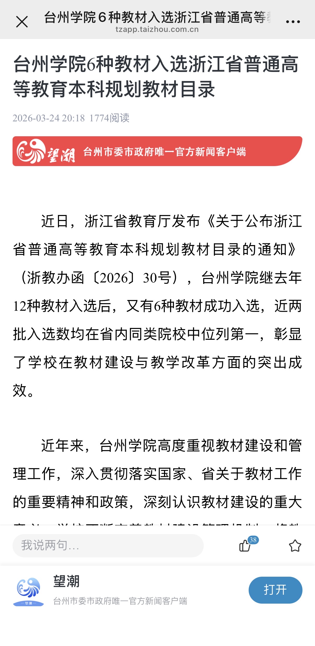 近日,浙江省教育厅发布《关于公布浙江省普通高等教育本科规划教材目录的通知》(浙教办函〔2026〕30号),台州学院继去年12种教材入选后,又有6种教材成功入选,近两批入选数均在省内同类院校中位列第一,彰显了学校在教材建设与教学改革方面的突出成效。