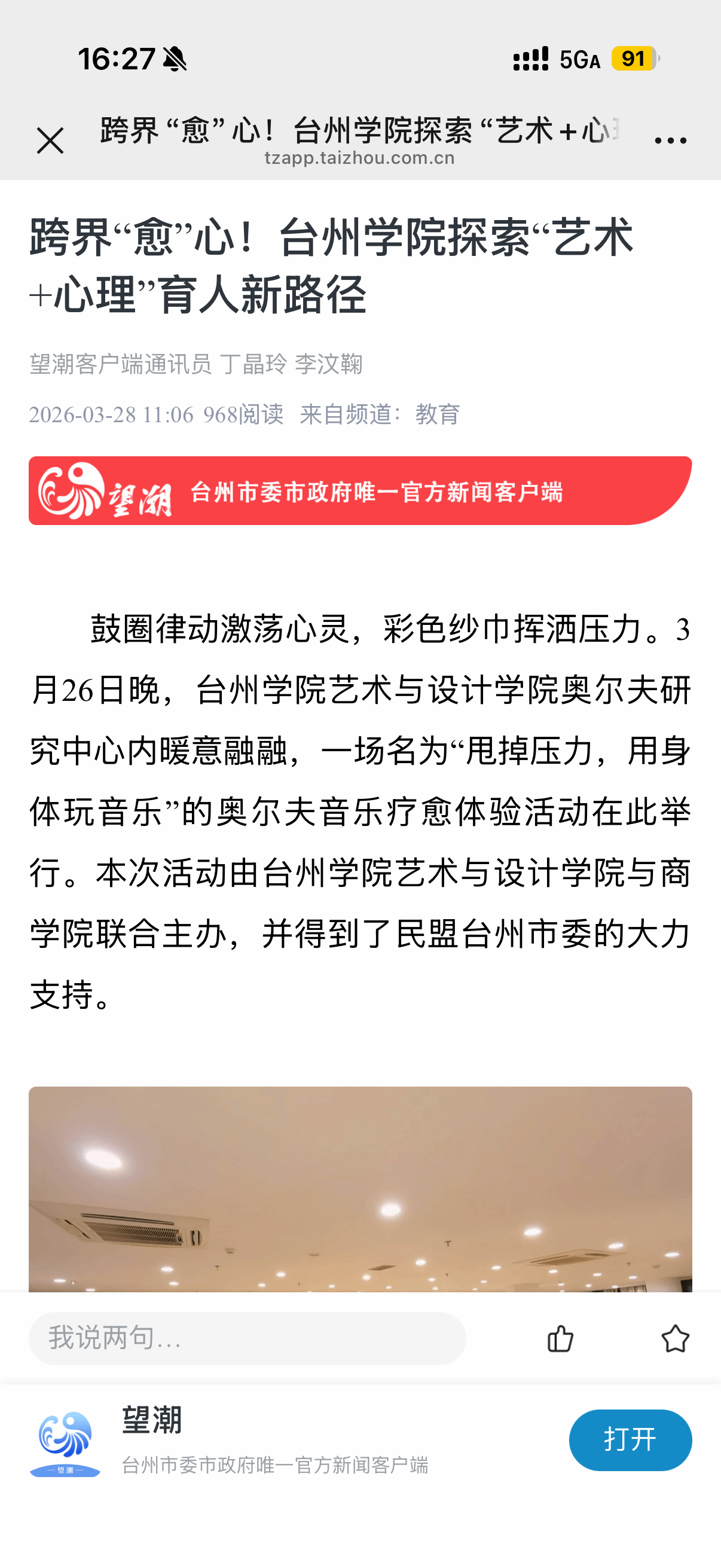 鼓圈律动激荡心灵,彩色纱巾挥洒压力。3月26日晚,台州学院艺术与设计学院奥尔夫研究中心内暖意融融,一场名为“甩掉压力,用身体玩音乐”的奥尔夫音乐疗愈体验活动在此举行。本次活动由台州学院艺术与设计学院与商学院联合主办,并得到了民盟台州市委的大力支持。