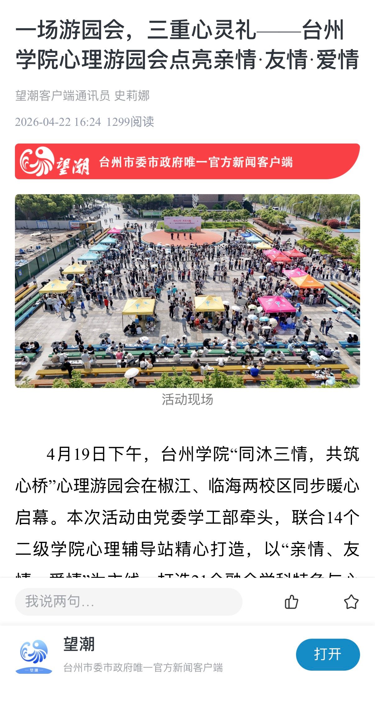 一场游园会,三重心灵礼。从亲情的深情回望,到友情的边界练习,再到爱情的双向奔赴,台州学院以体验式心理教育,让同学们在欢笑中读懂爱、学会爱、表达爱。未来,学校将持续创新心理育人形式,让温暖与陪伴常驻校园,让心灵成长之路充满阳光。