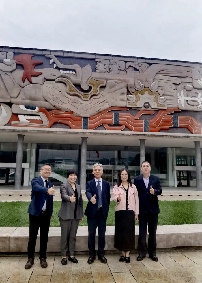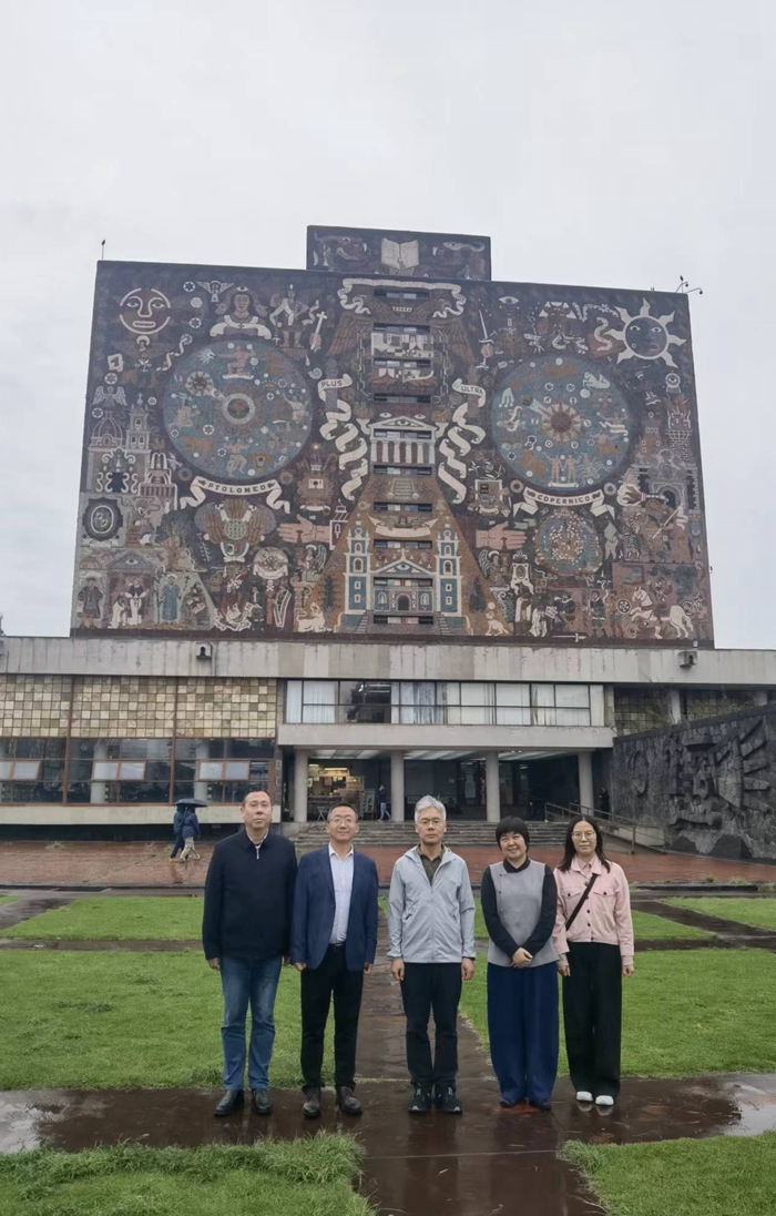在墨西哥国立自治大学,杨健国副校长率团参观了校长楼、中心图书馆等标志性建筑物。了解了该校的基本情况。该校在建筑学、工程学、化学、会计学、设计学、体育学等领域享有很高的社会评价,今后可在师生交流、短期互访项目等方面深入开展合作。