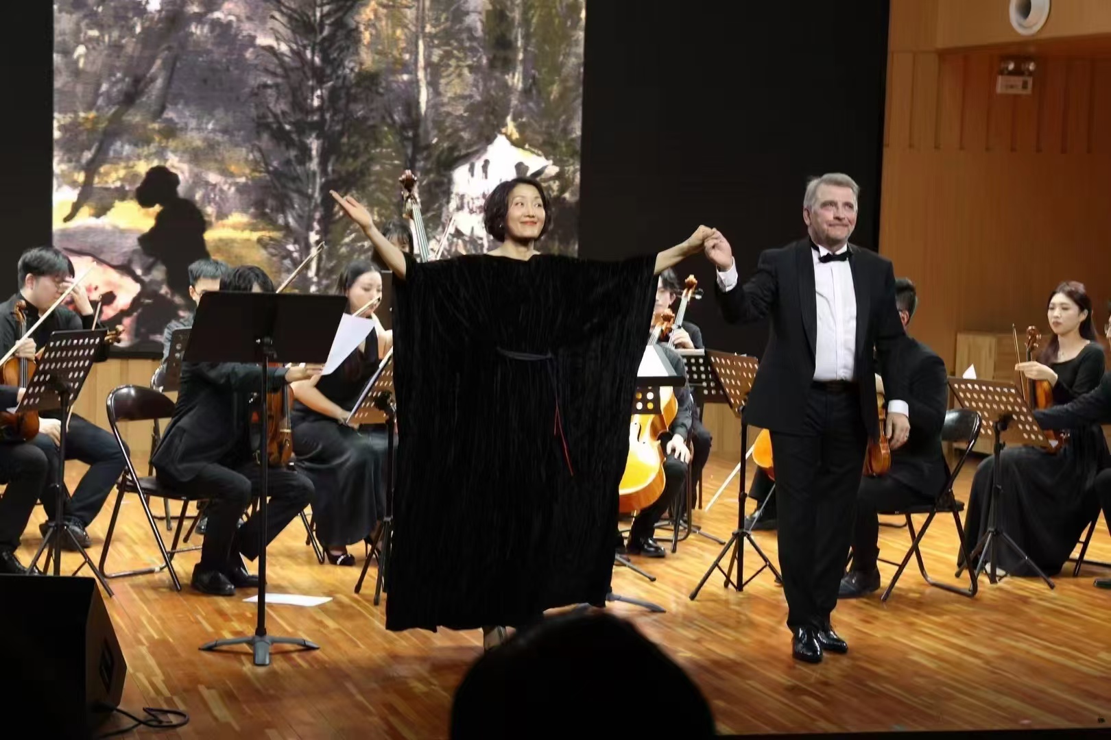舞台上,音乐家们动情地演绎着乐曲,大屏上滚动播放着吴立民先生的绘画作品。邱曙苇女士的声音如同晨曦中的阳光,温暖而诗意,清澈而充满力量;吴立民的绘画如同深邃广阔的交响曲,丰富而深刻,吟唱了生命的悲欣交集。这是一场法兰西的歌声与中国水墨的美妙邂逅,跨越时间与空间的界限,创造出无尽的可能性。