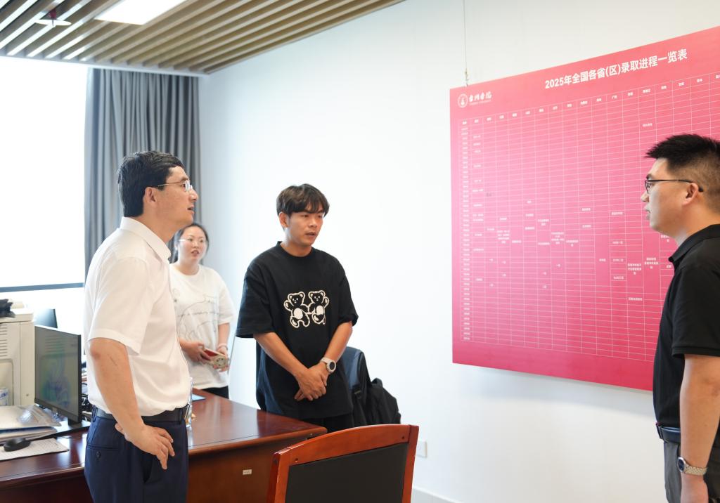 在本科招生录取现场,学校领导认真听取了教务处(招生办公室)关于近期学校全国各省(区)相关类型、批次的招生录取工作的汇报,详细询问了学校今年招生录取整体安排、当前进度进展,实地察看了录取通知书分装与邮寄工作,并慰问了暑期留校在岗师生,深入了解他们的学习生活情况。对下一阶段做好相关工作,校领导指出,要做到招生录取有章可循、过程规范、数据准确,确保工作万无一失;要优化服务做好招生服务,在录取通知书寄送上用心用情,在招生热线咨询上耐心细致;要努力提升招生信息化水平,通过完善制度,建立校内平台,持续强化招生录取数据的运用和监管。