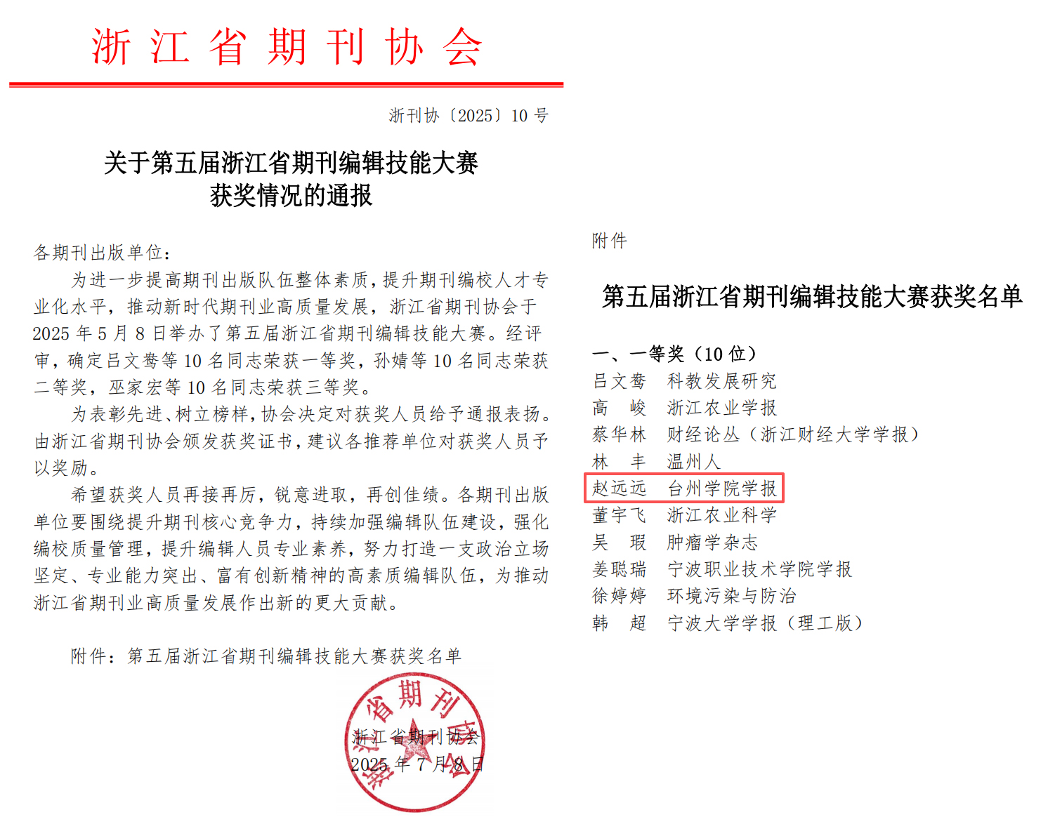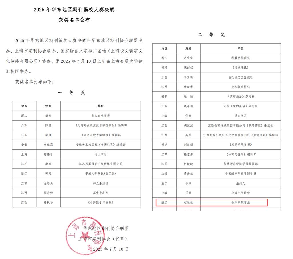 第五届浙江省期刊编辑技能大赛一等奖获奖名单