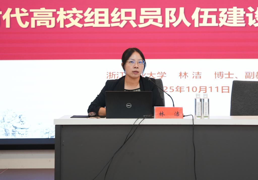 启动会后,学校举行了第一期党建论坛,浙江工业大学党委组织部副部长林洁作题为《新时代高校组织员队伍建设的实践与思考》辅导报告。她全面梳理了组织员的制度演进,分析了当前组织员队伍建设机遇与挑战并存的现实图景,并以浙江工业大学“浙组先锋”组织员领航工作室为例,提出了构建“选育管用”全链条建设体系的破局之道,激励全体组织员善用“聚力量、精业务、会方法、精气神”工作法,努力成长为新时代高校组织员精兵。
