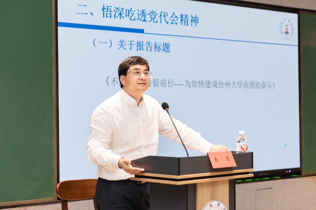 宣讲中,朱坚从学校第四次党代会报告标题拟定、大会主题、过去五年工作、学校使命、学校愿景、发展目标、发展战略、任务举措、党的建设等九个方面,对学校第四次党代会精神的精神实质和核心要义进行了全面阐释和系统讲解。朱坚指出,校第四次党代会报告以“不忘初心 勇毅前行——为加快建成台州大学而团结奋斗”为题,这既是报告的灵魂,也是报告的点睛之笔。其中,“不忘初心”旨在阐明办学的目的是为党育人、为国育才;“勇毅前行”是学校全体党员和广大教职工应有的姿态;“建成台州大学”是我们的目标;“团结奋斗”则是力量源泉和发展保障。而大会主题是贯穿党代会报告的一条主线。其中,“深化改革创新”是发展的动力所在,“破除发展瓶颈”是需要直面的问题,“加强内涵建设”是办学治校的主题主线,“推进校城共生”是学校发展的路径和模式。
