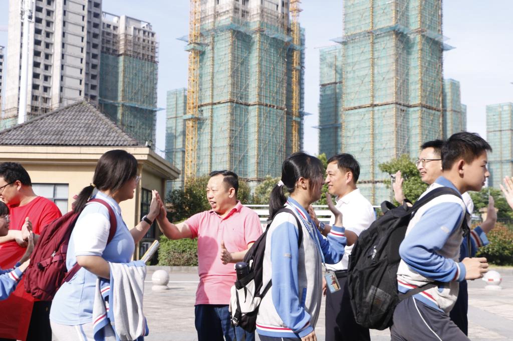 乐传永及学校相关部门负责人、椒江区教育局副局长李文斌、葭沚街道办事处副主任陈珍琳等列队在附属学校大门口,迎接每一位考生进校,并与他们握手、击掌。乐传永勉励考生们沉着应战、细致认真,以最佳的状态,考出最佳成绩。