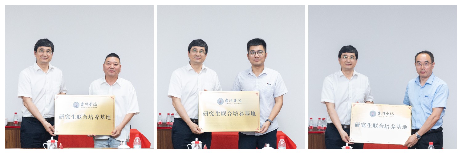 朱坚分别向西格迈股份有限公司董事长汪贤能、元创科技股份有限公司总经理郑啸、浙江绿岛科技有限公司副董事长王小兵授予“研究生联合培养基地”铜牌。学科处负责人代表学校签订协议。