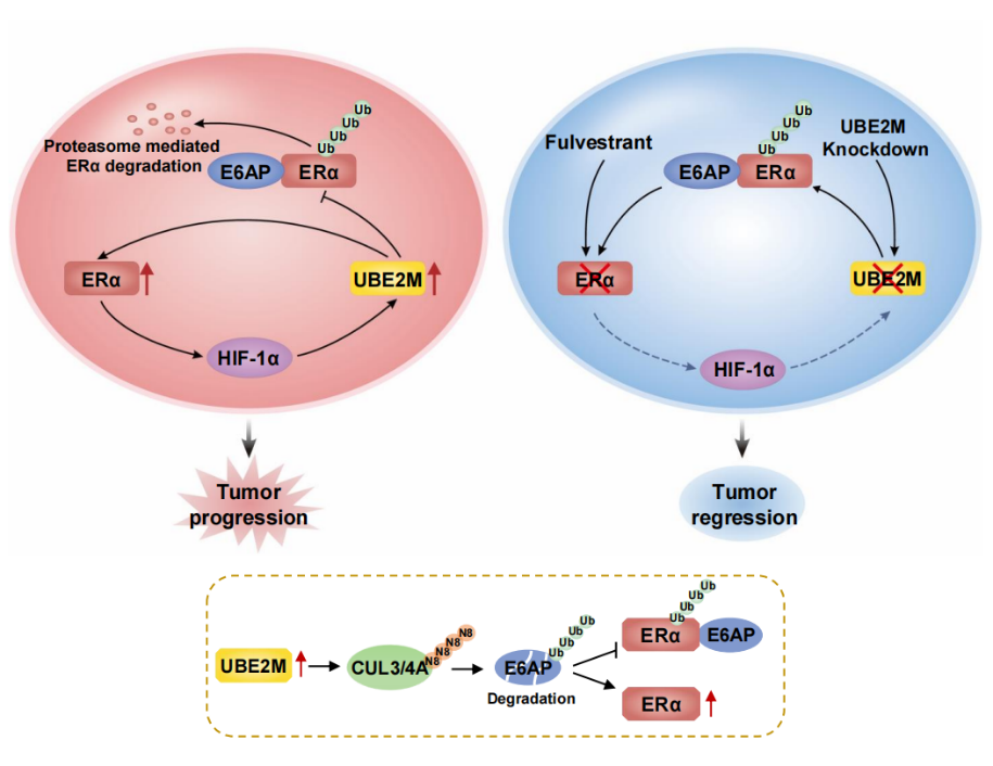 乳腺癌作为全球女性最常见的恶性肿瘤之一,其治疗和预后一直是研究的热点。特别是雌激素受体阳性(ER+)乳腺癌(占乳腺癌70%),由于其对内分泌治疗的依赖性,对新型治疗策略的需求尤为迫切。然而,目前对于ER+乳腺癌的分子机制仍有许多未知之处,尤其是在乳腺癌细胞增殖和内分泌治疗耐药方面。本研究聚焦于NEDD8结合酶UBE2M在ER+乳腺癌中的作用,旨在揭示其在乳腺癌进展和氟维司群耐药中的重要作用。