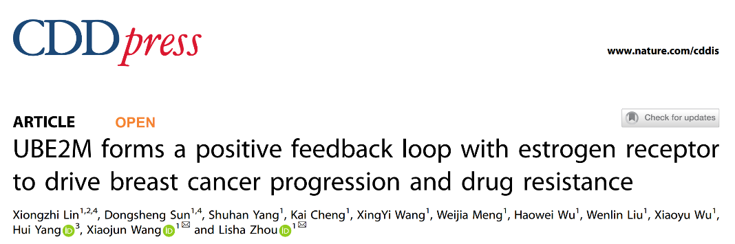 近日,医学院周丽莎博士在Cell Death & Disease(中科院SCI医学大类一区Top期刊,IF: 8.1)上发表了题为“UBE2M forms a positive feedback loop with estrogen receptor to drive breast cancer progression and drug resistance”的研究论文。台州学院为第一完成单位,医学院周丽莎博士为该论文的最后通讯作者,台州市中心医院王晓军主任为共同通讯作者。台州学院与河北北方学院联合培养研究生林雄智和医学院孙东升博士为第一作者。