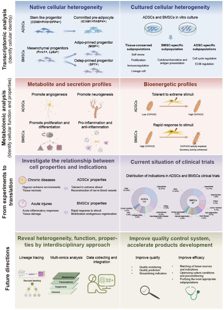 图2. ADSCs和BMSCs细胞异质性、应用潜力和未来研究方向总结