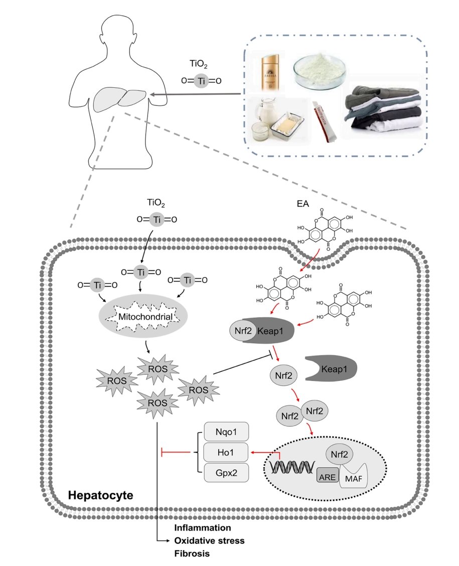 二氧化钛纳米颗粒(TiO2 NPs)因其广泛的应用而引起了对其安全性的关注。研究表明,TiO2 NPs可能导致肝损伤,主要通过引发氧化应激和炎症反应。鞣花酸(EA)是一种从自然来源提取的膳食多酚,已知具有抗氧化和抗炎特性,但其在减轻TiO2 NPs诱导的肝损伤中的作用尚不明确。本研究展示了EA在TiO2 NPs诱导的肝损伤中的保护作用。EA能够显著降低肝细胞的细胞毒性、氧化应激和炎症标志物,并且在小鼠实验中,EA治疗显著降低了血清转氨酶水平。此外,EA还减少了小鼠肝脏的应激反应、炎症和纤维化,效果与阳性对照药物硫代葡萄糖苷(SFN)相当,其作用机制主要通过Nrf2的核转位和磷酸化实现。该研究为EA作为一种天然的Nrf2激活剂在治疗TiO2 NPs诱导的肝损伤中的潜在应用提供了新的视角。通过激活Nrf2通路,EA能够减轻肝损伤并改善肝功能,提示其在肝脏疾病治疗中的应用前景。