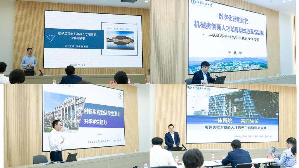 论坛聚焦“打造学科竞赛驱动引擎,助力卓越创新人才培养”主题,邀请教育部机械基础课程教学指导分委员会委员、浙江大学国家级机械示范中心主任顾大强教授,江苏科技大学教务处副处长田桂中教授,浙江工业大学机械工程学院副院长李曰兵教授,杭州职业技术学院特种设备学院党总支书记、执行院长郭伟刚教授等专家,分别围绕“机械工程专业卓越人才培养的探索与思考”“数字化转型时代机械类创新人才培养模式改革与实践”“创新实践激活学生潜力,升华学生能力”“一体两院,同生共长:电梯类技术技能人才培养生态构建与实践”等主题作了专题报告,会场掌声阵阵。与会代表还就论坛主题展开了深入研讨和交流。