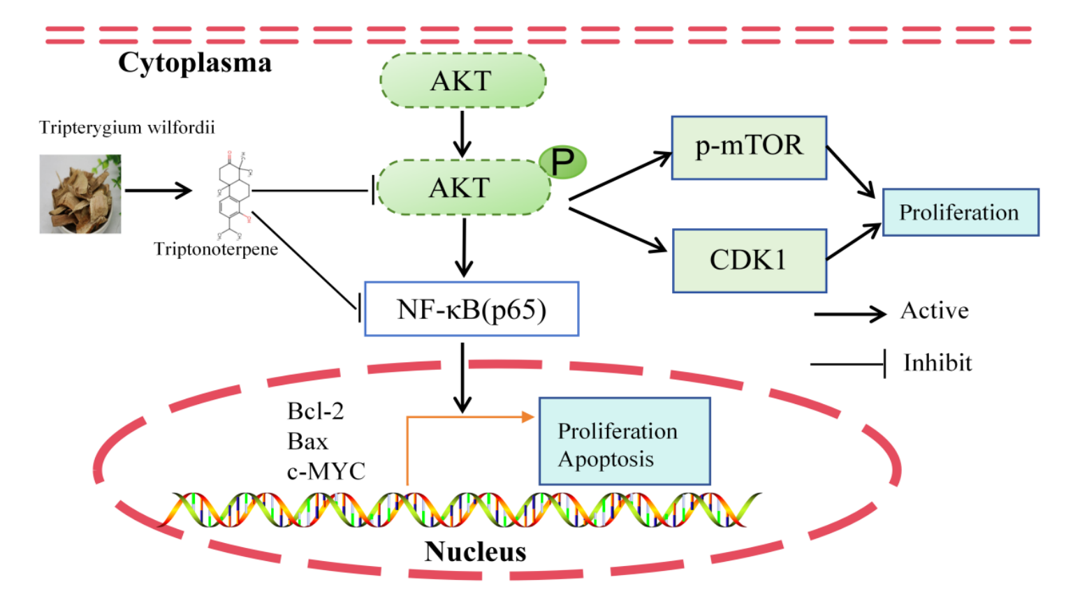 该研究使用网络药理学、分子对接、分子动力学模拟等生物信息学技术,挖掘雷公藤作用于前列腺癌的潜在活性成分和药物靶点,系统性地建立了雷公藤抗前列腺癌的药物靶点网络和PPI网络,在细胞水平和动物水平验证了雷公藤的关键活性成分雷酚萜靶向AKT和p65发挥抗前列腺癌的分子机制。该研究揭示雷酚萜是一种潜在的抗前列腺癌症药物,作为p-AKT和p65的靶向抑制剂,可以抑制前列腺细胞增殖并诱导细胞凋亡,这为今后开发雷酚萜作为抗前列腺癌候选药物提供了重要的理论支撑。台州学院联合培养博士生桑亚洲为该论文的第一作者,医学院/高等研究院青年教师胡岳博士为并列第一作者,曹轩教授为该论文的第一通讯作者,台州学院为该论文的第一单位。