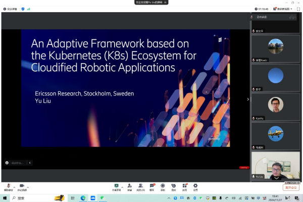 最后,刘禹博士以《An Adaptive Framework based on the Kubernetes (K8s) Ecosystem for Cloudified Robotic Applications》为主题进行了汇报。他详细解读了自适应框架的设计原理及其在云化机器人应用中的显著优势,并呼吁通信、计算机和控制三个学科应协同设计,以提高系统的整体性能,从而为机器人的研究和开发带来新范式。