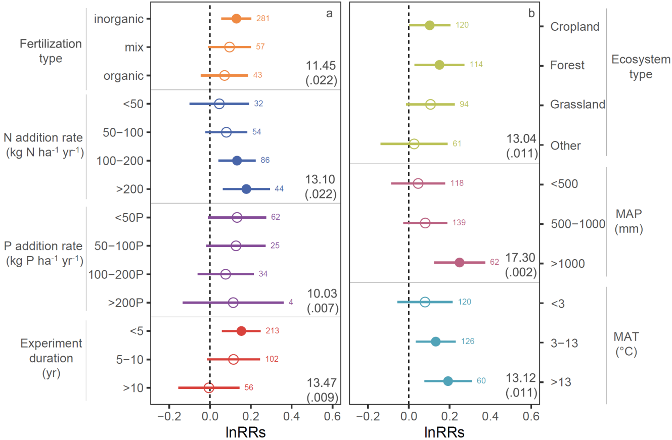 微生物碳利用效率(CUE)是衡量微生物生长、呼吸对土壤碳积累和损失的综合指标,被认为是决定土壤有机碳(SOC)命运的关键指标。微生物CUE对土壤养分(N、P)的变化响应敏感,大气氮沉降、化石燃料燃烧、田间施肥等气候变化和人为活动引起全球范围内N、P的广泛输入,因此养分添加对CUE的影响科学评估显得尤为重要,特别是由此引发的SOC积累的变化。本研究收集了58个研究中的389组观测数据,采用Meta分析研究了微生物CUE对养分添加的响应及驱动因子,探究了养分添加下微生物CUE与SOC的关联。