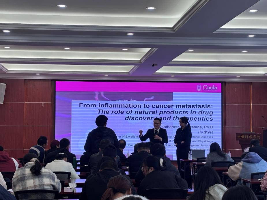 Pornchai Rojsitthisak详细介绍了朱拉隆功大学药学院卓越天然产物与老年慢性病研究中心在药物发现领域的综合方法。研究从基于天然产物的传统方法出发,系统性地开发了一种来自泰国兰花品种Dendrobium formosum的提取物,用于治疗骨关节炎。研究团队鉴定了关键的生物活性化合物,并通过体外和体内实验验证了其抗炎活性,并展示了利用人工智能进行现代药物发现的研究。介绍了应用RUSH云端平台对CXCR4抑制剂进行虚拟筛选,以靶向癌症转移的研究。通过从传统天然产物研究到人工智能加速药物筛选的转变,该中心将传统知识与现代工具相结合,以应对老年和慢性疾病的挑战。会后,师生们踊跃提问,就药物研发的技术细节、未来发展方向等问题与Pornchai Rojsitthisak展开了热烈的交流与探讨,现场学术氛围浓厚。