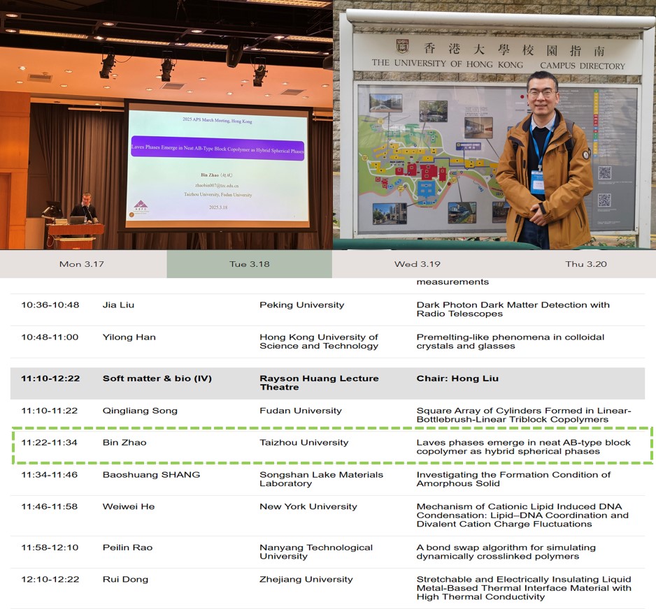 近日,材料科学与工程学院赵斌博士受邀参加在香港大学举办的美国物理学会(American Physical Society, APS)年会,并作题为《Laves phases emerge in neat AB-type block copolymer as hybrid spherical phases》的学术报告,展示了我校在高分子物理与自组装领域的最新研究成果,受到国际同行广泛关注。