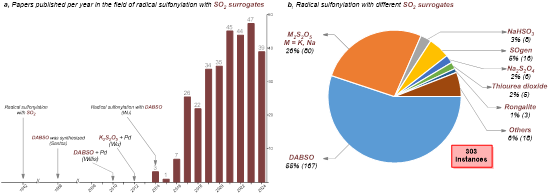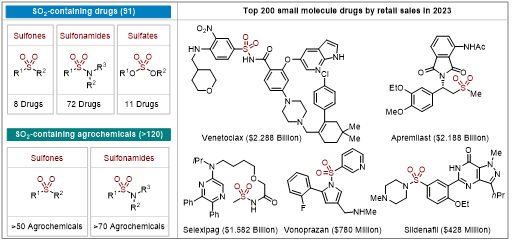 二氧化硫是主要的大气污染物之一,其年均排放量高达1亿吨(Environ.Sci.Technol.2020,54,6508)。二氧化硫的排放会导致严重的环境问题和公共卫生问题。常见的脱硫方法主要有石灰石吸收法、有机溶液吸收法、活性炭吸收法以及还原脱硫法等。然而上述脱硫策略常会产生大量的二次污染物。从可持续发展和绿色化学的角度来看,开发简洁高效的二氧化硫捕获方法具有重大的意义。二氧化硫是重要的硫源,其可以广泛应用于磺酰类化合物的合成当中。目前上市的药物分子中有91种含-SO2-(磺酰基)结构,在农药领域则有超过120种农药含有-SO2-(磺酰基)结构。因此将二氧化硫应用到有机合成及药物合成当中具有重要的学术价值和市场价值。然而气态二氧化硫应用方法存在着诸多缺陷,极大制约了其在合成领域的应用。