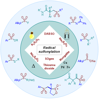 为此化学家们发展了一系列二氧化硫替代物。常见的二氧化硫替代物有Willis课题组在2010年发展的有机二氧化硫替代物—DABSO(J.Am.Chem.Soc.,2010,132,16372.);以及吴劼教授课题组在2012年发展的无机二氧化硫替代物——焦亚硫酸盐(Chem.Commun.,2012,48,10037.)。由于二氧化硫的亲电特性,早期的二氧化硫反应主要是与有机金属试剂反应,以此实现砜类化合物的合成;随后逐渐发展了基于过渡金属催化剂的偶联反应。2014年,吴劼教授课题组开创性地报道了基于自由基反应的二氧化硫插入策略(Angew.Chem.,Int.Ed.,2014,53,2451.),自此二氧化硫参与的自由基反应逐渐兴起,相关研究方兴未艾,并成为研究热点。本综述系统介绍了各类二氧化硫替代物的发展现状,根据自由基产生方式,细分为光催化、电化学合成、过渡金属催化以及热力学引发的自由基磺酰化四个部分,全面阐述了基于二氧化硫参与的自由基磺酰化反应。