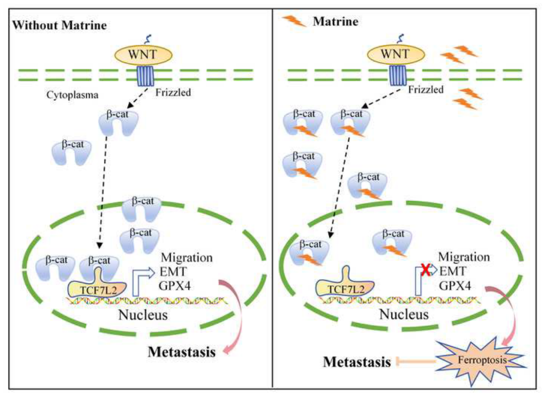 近日,医学院/国际护理学院曹轩教授团队在《Phytomedicine》(中科院大类、小类均一区,TOP期刊,IF: 8.3)发表题为“Matrine targets β-catenin and blocks the formation of β-catenin/TCF7L2 complex to promote ferroptosis and inhibit metastasis in triple-negative breast cancer”的研究论文。