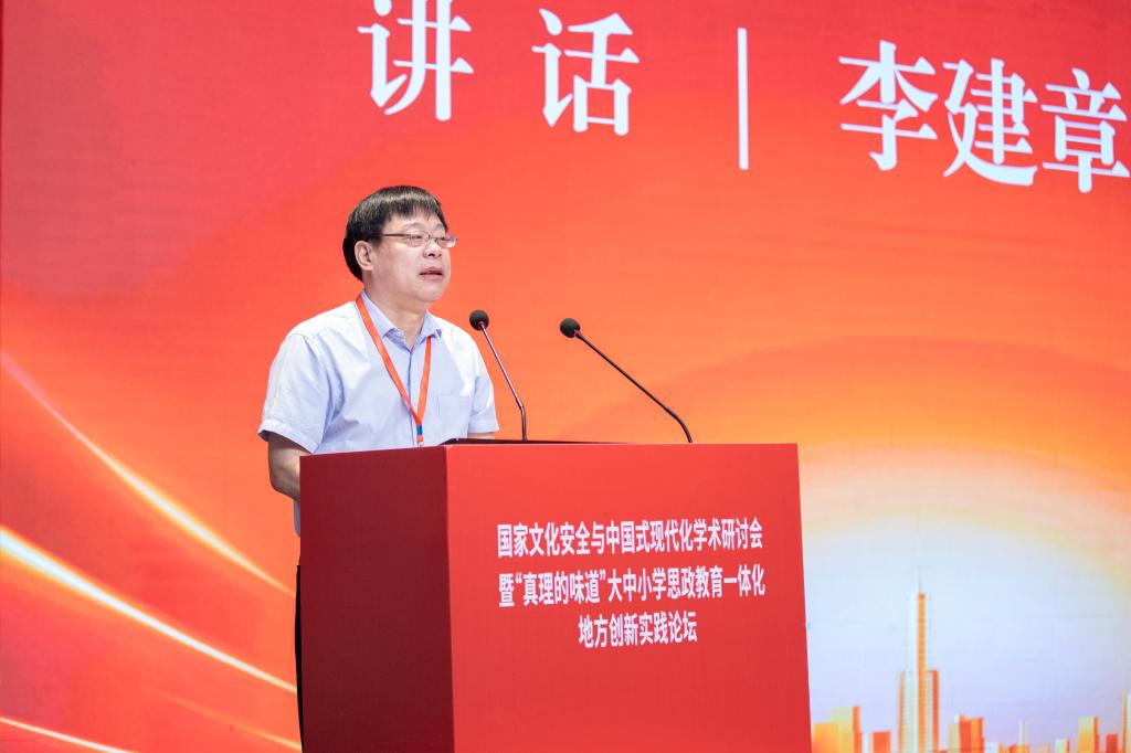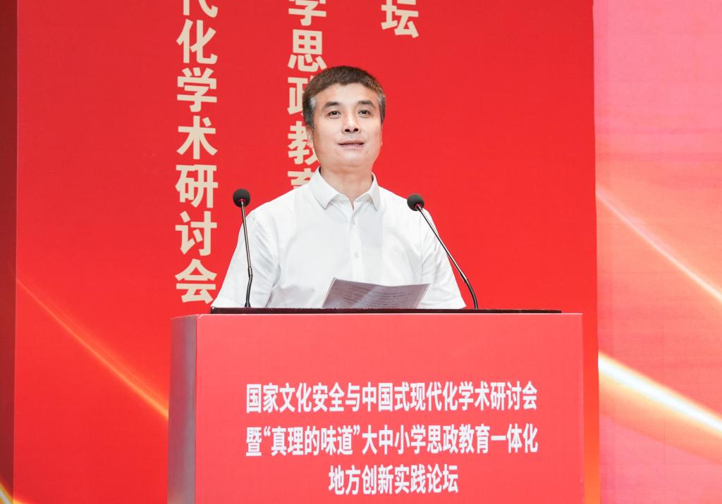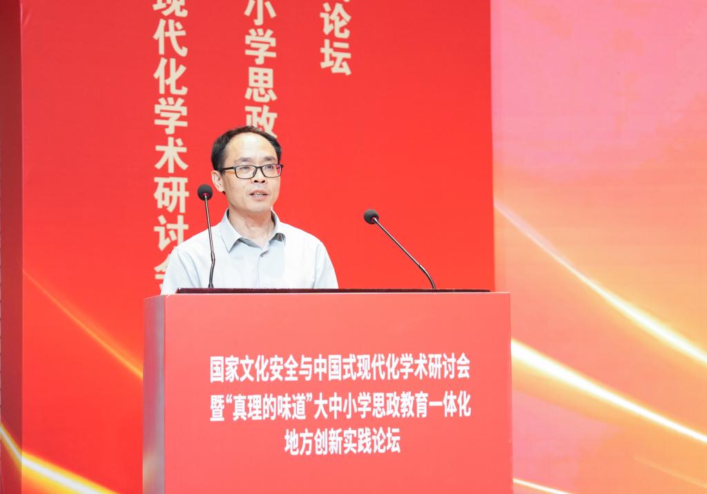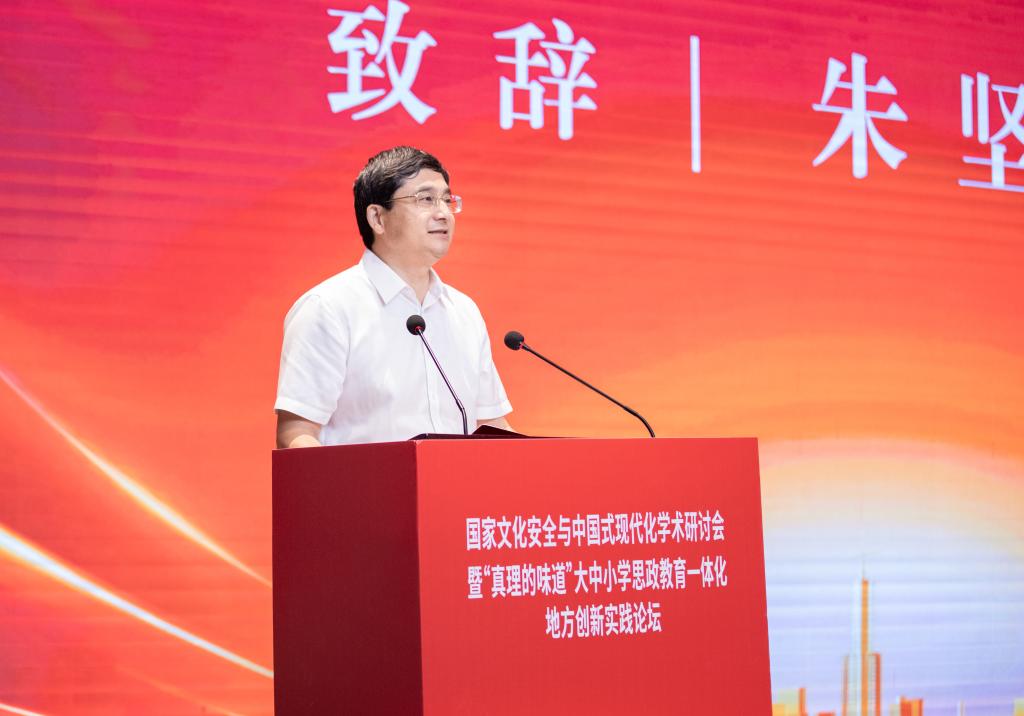 朱坚在致辞中表示,台州学院高度重视大中小学思政教育一体化建设。学校始终坚持系统思维,强化顶层设计,结合台州区域实际,以打造“和合思政”品牌为目标,制订实施“核心+配套”系列政策,强化教研、课堂、实践及研修四个平台的一体化建设,构建具有区域特色的一体化“四环联盟”工作体系。他介绍,台州市大中小学思政课一体化研究中心在大中小学思政教育一体化建设方面形成了不少特色和地方创新做法,推动了台州市大中小学思政教育资源共享、优势互补、协作共进、质量提升,一体化建设取得了一个又一个可喜的成绩,受到了省、市领导多项肯定性批示及好评,为我省乃至全国各地开展大中小学思政课一体化建设提供了宝贵的地方实践经验。朱坚希望,出席本次会议的专家学者能以“国家文化安全与中国式现代化”为主题,就新时代大中小学思政教育一体化建设的形势、理论、地方实践创新等方面进行深入探讨,进而促进大中小学思政教育一体化建设的发展,提高大中小学思政教育的实效性和针对性,为推进大中小学思政教育一体化实践提供借鉴和经验。