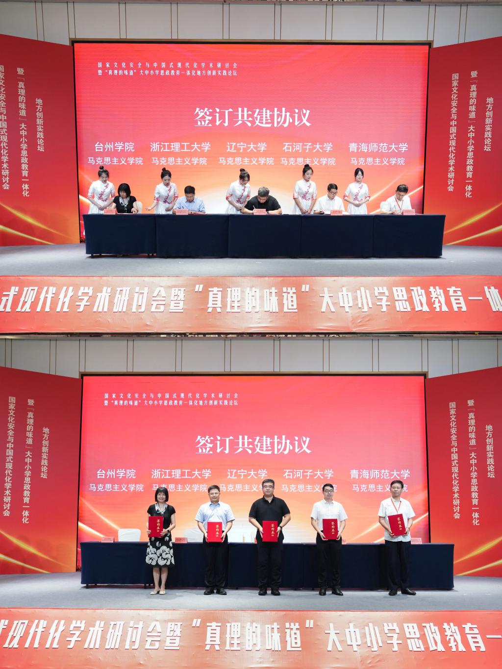 闭幕式上,我校马克思主义学院院长张天华与来自浙江理工大学、辽宁大学、石河子大学和青海师范大学四所教育部指定的各省大中小学思政教育一体化牵头高校马克思主义学院院长签订战略合作协议,以期实现大中小学思政课和思想政治教育一体化跨省跨市跨校地方创新实践的优势互补和资源共享。