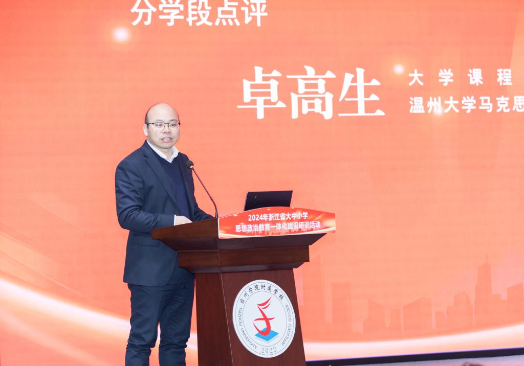 温州大学马克思主义学院院长卓高生对账张建庆老师的课给予了点评。他认为,张建庆老师给我们带了一堂关于共同建设法治社会,展现的风格与小学、初中、高中明显不同,课堂上蕴含着思想性、理论性、思辨性。在课程的这个设计里,张老师根据法治这个主题,如何从马克思主义的理论,如何从中国传统优秀的文化,两个结合的视角来阐释这个命题,然后又从学生的这种互动的问答过程之中,来进一步增强增进学生的理论思辨。