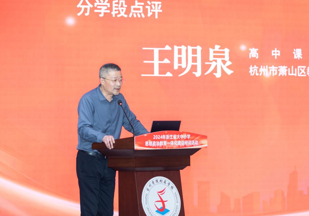 杭州市萧山区教育发展研究中心王明泉点评了宗艺煊老师的示范课。王老师认为,宗老师的课有三个方面是非常突出的,也可以概括为三个充分。一是充分认识高一学生已有的学习基础,站在高中生的角度来进行教学设计。二是充分运用不同时代通用的教学方法,充分彰显高中政治学科的教学特点。三是情景的复杂程度,高中阶段情境式复杂的,宗老师安排的环节评价各主体做法,评估的影响,对学生来说挑战性还是比较大。