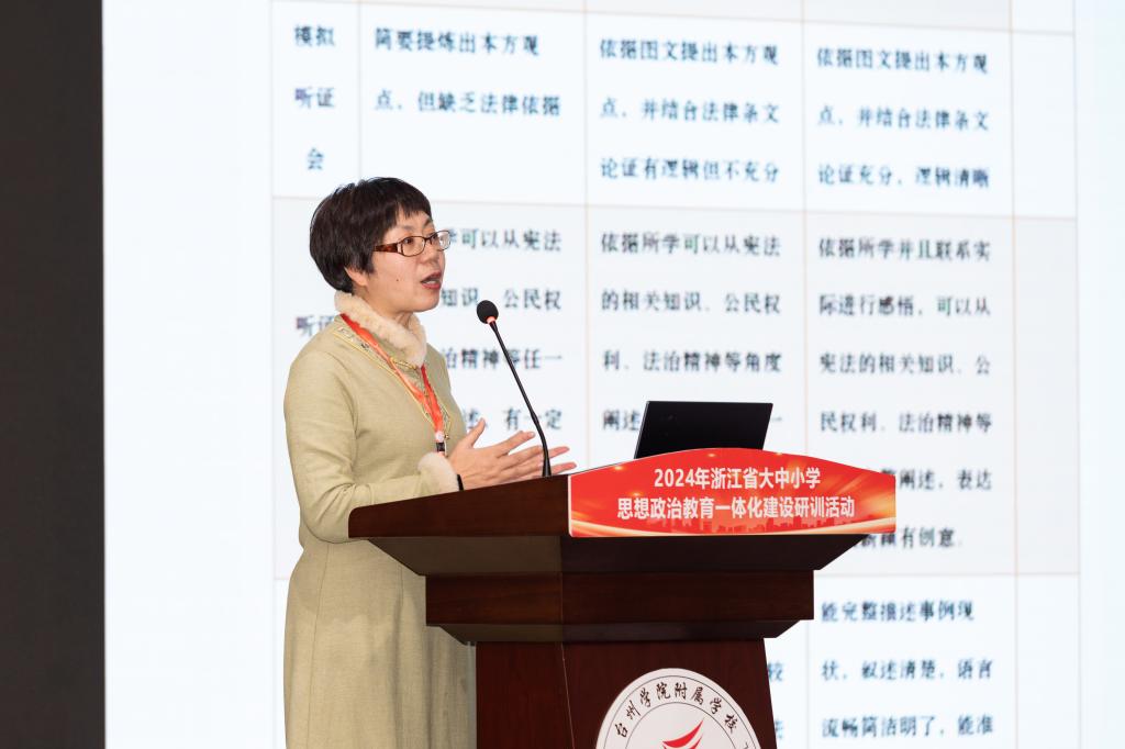 浙江省教育厅教研室教研员邬冬星老师从一体化的视角做了综合点评。她认为,今天授课的四位老师选的题目都是法治教育,从小学、初中、高中到大学体现了这样教材设计的一体化。在各个学段的课程标准是学段衔接,循序渐进,层次递进、螺旋上升,所以今天下午的课看到各个学段教学目标,体现了层次递进。第二,法治教育内容是螺旋上升的,遵循了学生从小学到大学,从自我到与他人、与社会、与国家的种种关系的基础上,不断加深和拓展的这样的一种思路。第三,法治教育方式体现了能力进阶,要提高法制教育和这个质量的成效,它有一个基本的前提,那就是要遵循学生身心发展的规律,基于他的认知和能力基础来选择合适的方法。今天的示范课结合各个学段孩子和学生的身心特发展,点采用了案例式、体验式、项目式、议题式等多种方法,体现了能力进阶。