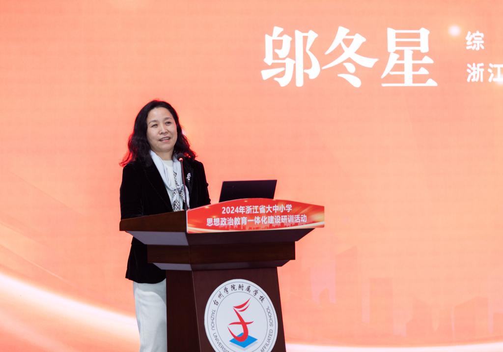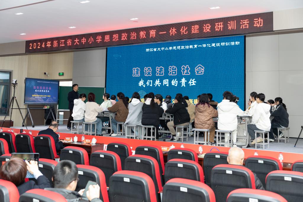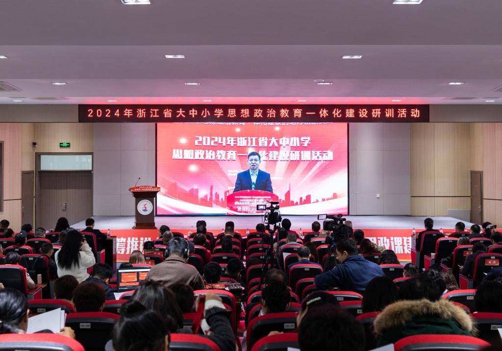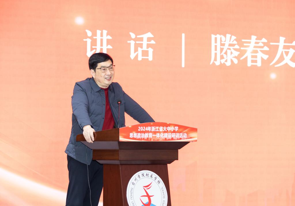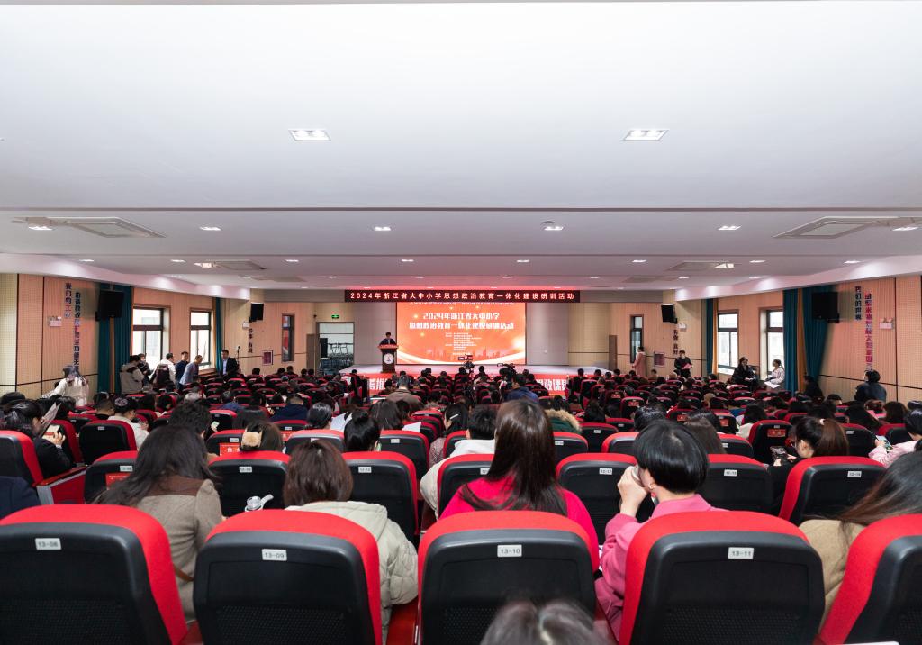 为贯彻落实党的二十大精神和习近平总书记关于思政课的重要论述精神,切实推进大中小学思想政治教育一体化建设,3月18日至19日,浙江省大中小学思想政治教育一体化建设研训活动在台州学院附属学校举行。研训活动由浙江省教育厅教研室主办,台州学院马克思主义学院、台州市大中小学思政课一体化研究中心、台州市教育教学研究院、新疆第一师阿拉尔市教育局承办,台州市椒江区教育教学发展中心、台州学院附属学校、塔里木高级中学协办。浙江省各市大中小学350余名思政课名师、骨干教师、中小学教研员、在校大中小学生代表参会,新疆生产建设兵团第一师阿拉尔市塔里木中学260余名教师代表线上集中参会,中国教研网全程直播,线上有16000余名思政同仁参加研训活动。