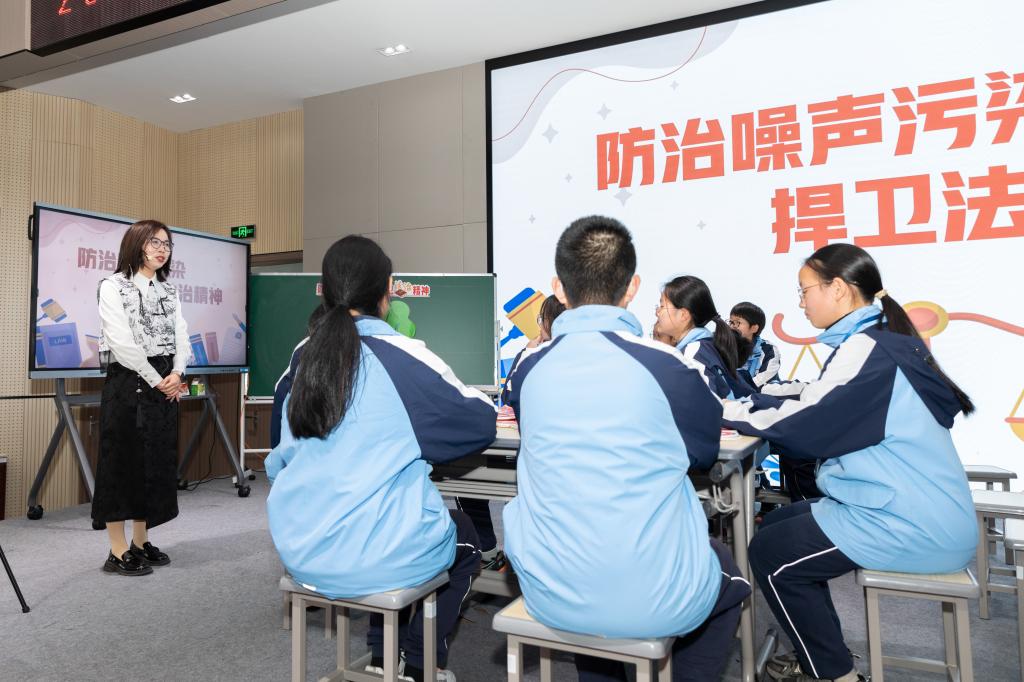 叶玺涵老师开出了课题为“图防治噪声污染 捍卫法治精神”的初中道德与法治课。针对这一实际情况,设置驱动性问题——午休期间学校周围是否应该停止施工,何老师以模拟听证会的形式,让学生从生活出发,站在不同角度,充分运用法律知识去分析、解决问题。通过生动有趣的环节设计,让同学们进一步提升法治意识,在孩子们的心中播撒下了“尊法、学法、守法、用法”的种子,使同学们在轻松有趣的氛围中学习到了更多法律知识。