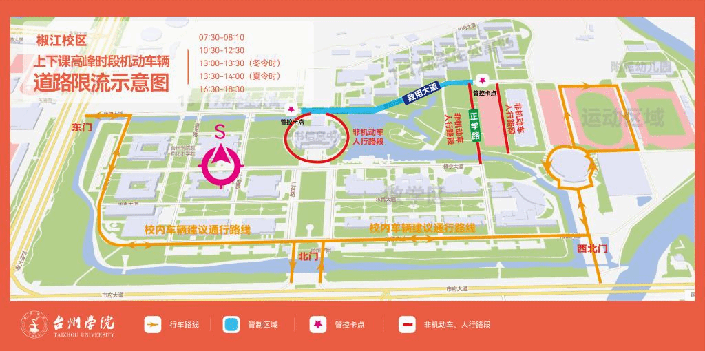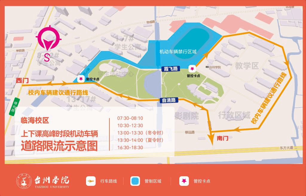 2.除校内公务车辆外,校园限流区域内原停放车辆“只出不进”,区域外车辆不得驶入限行区。在校内的车辆须遵守道路安全交通法律法规和学校相关管理规定,听从现场工作人员引导,减速慢行,主动避让行人和非机动车,并按规定有序停放。违者将依据《台州学院校园机动车辆管理办法(试行)》作出限制入校等处理。