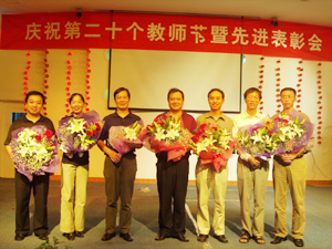 校党委委员、纪委书记梁治文宣布了2003年我校获得各级荣誉的教师名单。获得“全国模范教师”称号的冯尚申、“省高校优秀辅导员”赵校民、李友富以及 “省‘三育人’先进个人”徐台榜等11人上台领奖。他们表示,鲜花和掌声是荣誉,也是激励,更多的是期待,他们会以此为起点,敬业爱生,严谨治学,为社会培养有用之才。