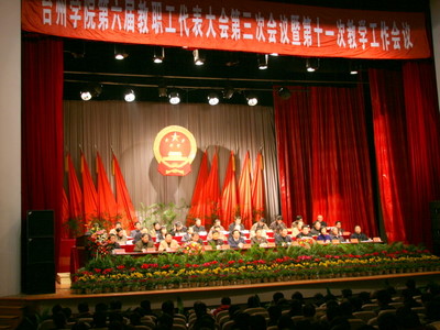 2:30,校六届三次教代会暨第十一次教学工作会议正式开幕。校领导陈浩、龚建立、包国强、 韩建飞、张明龙、张辉、冯尚申、王培军、李茂珍、王正,老领导杨森、郭友于在主席台前排就座。各学院及部门主要负责人、部分老领导出席会议并在主席台就座。教代会正式代表、特邀代表、列席代表及学校全体专任教师、政工教辅人员等近900人参加开幕式。